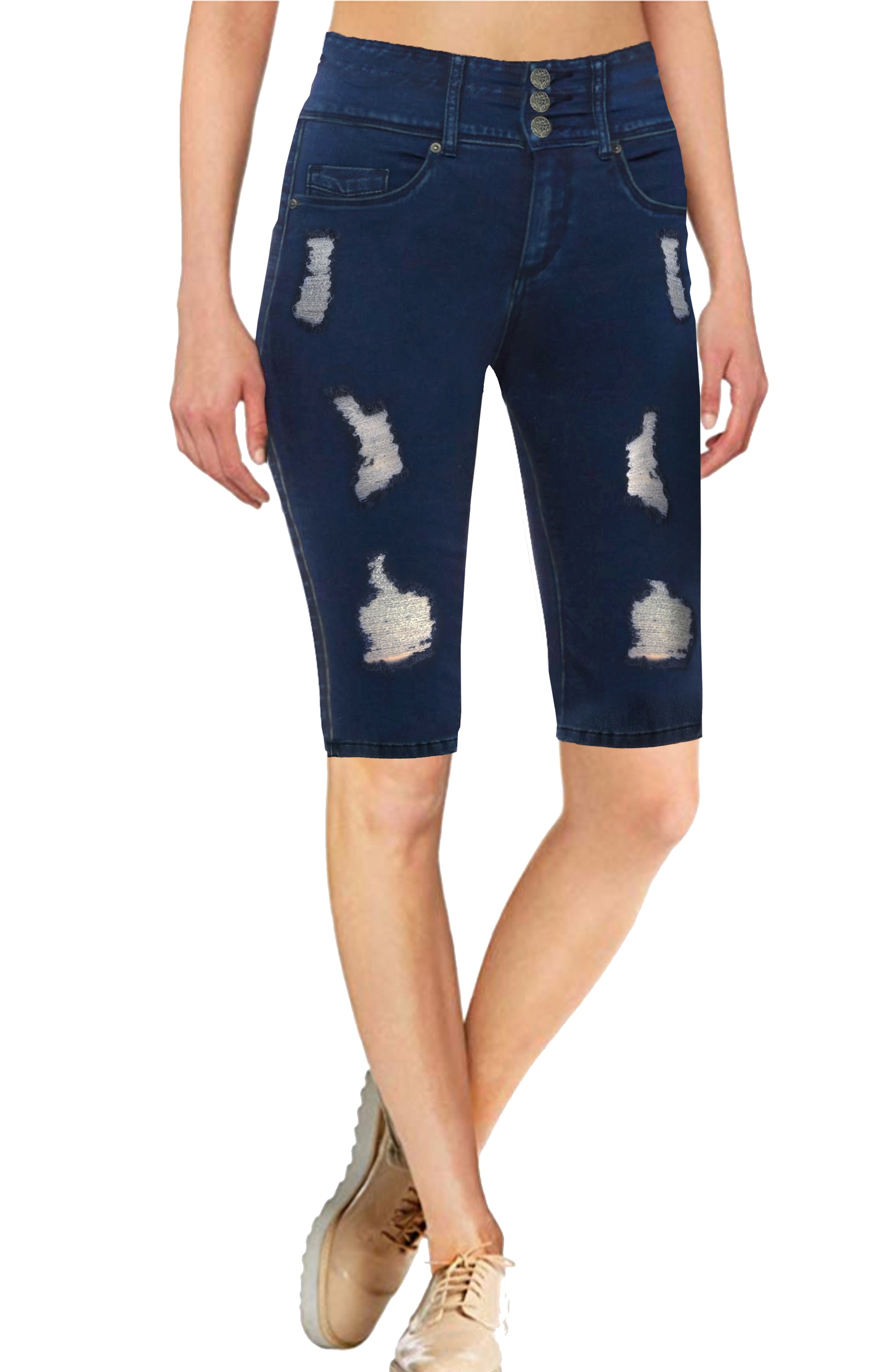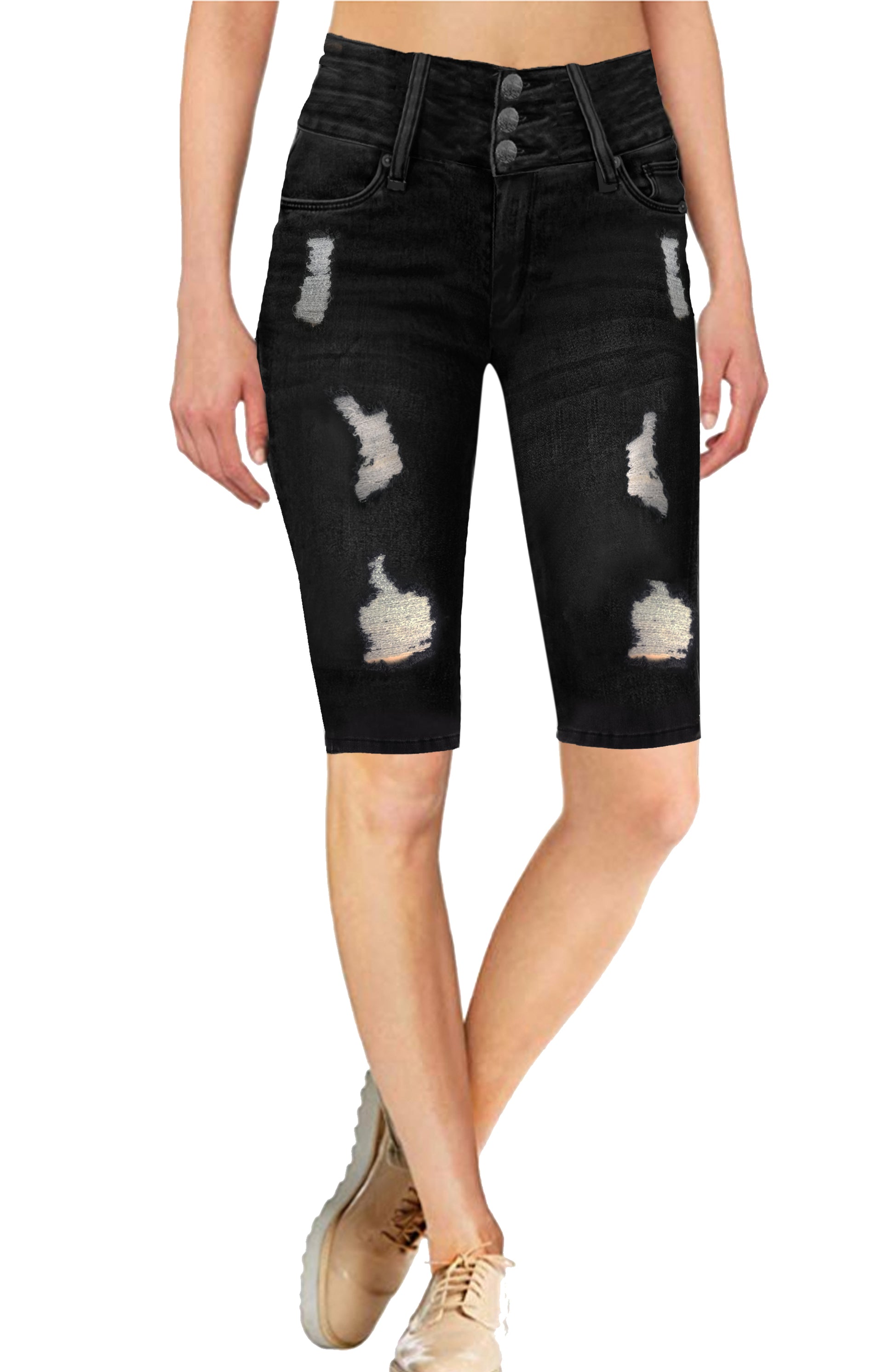 Women Ripped/Destructed Butt Lift 3 Button High Wide Waist Bermuda Short